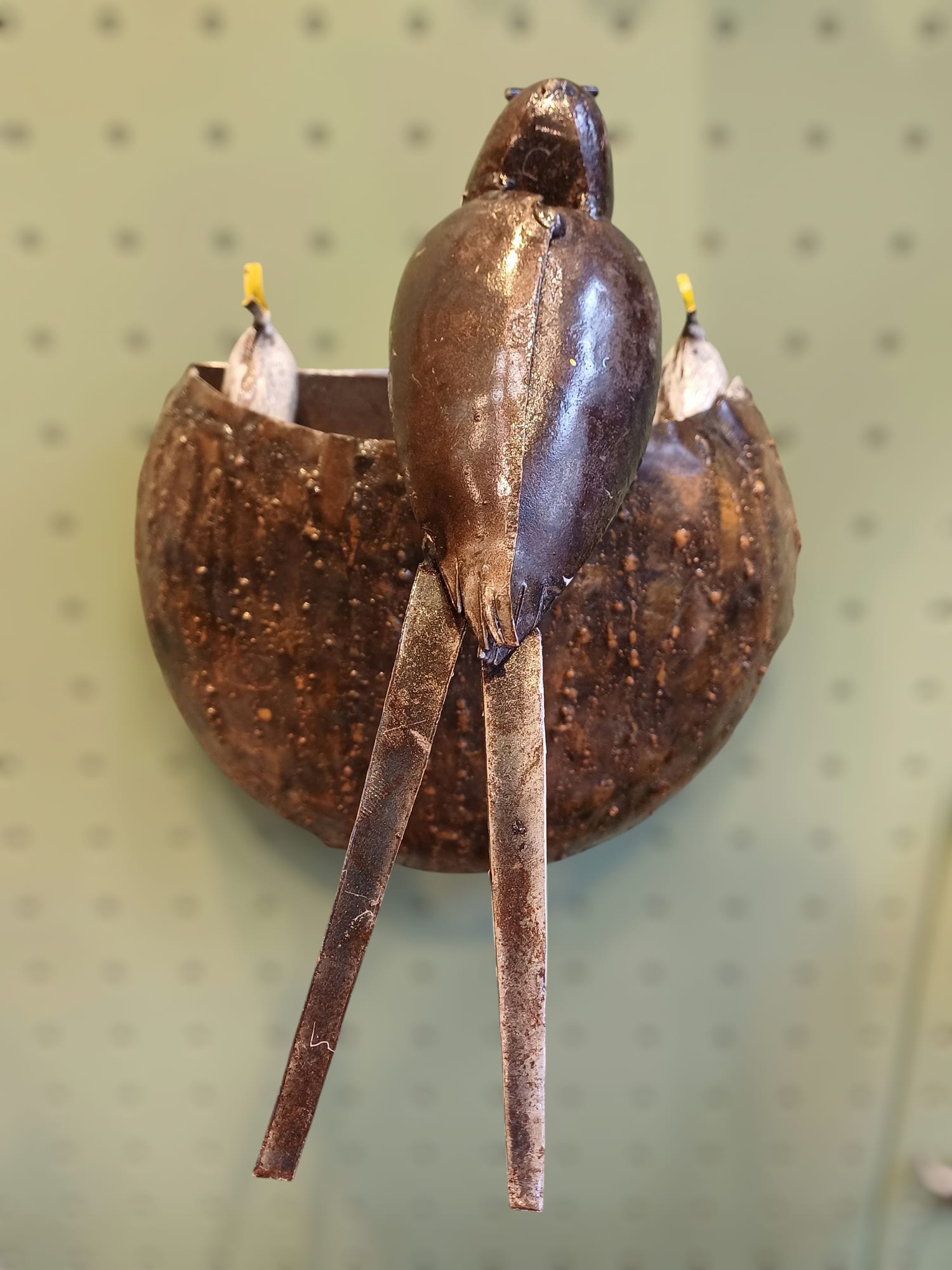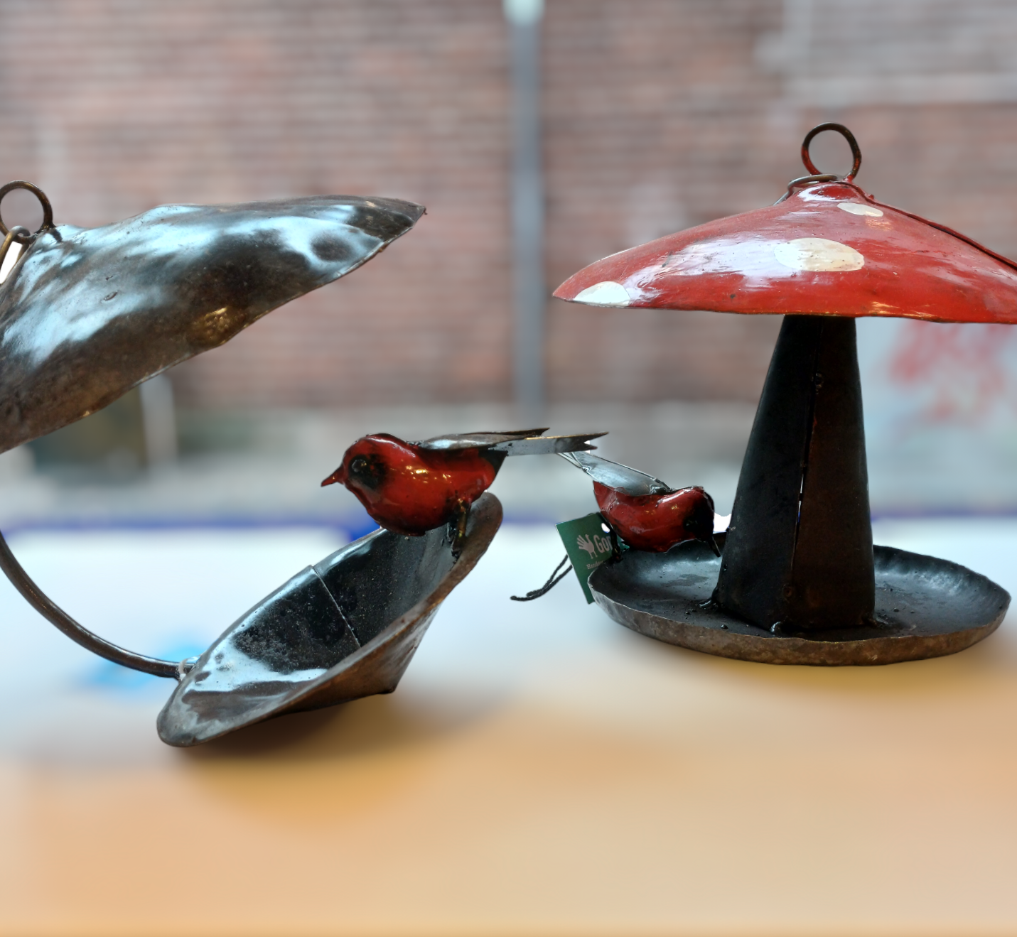De vogelvoederbakken zijn handgemaakt in Zimbabwe. Ze zijn gemaakt van oude olievaten, oude auto’s of andere restmaterialen. Op deze manier produceren zij hun producten met respect voor het milieu. Onze importeurs betalen niet alleen een faire prijs voor de artikelen, maar begeleiden de ondernemers ter plaatse. Denk hierbij aan veilig werken, goede gereedschappen, financiële planning, onderwijs faciliteiten en gezondheidszorg.
