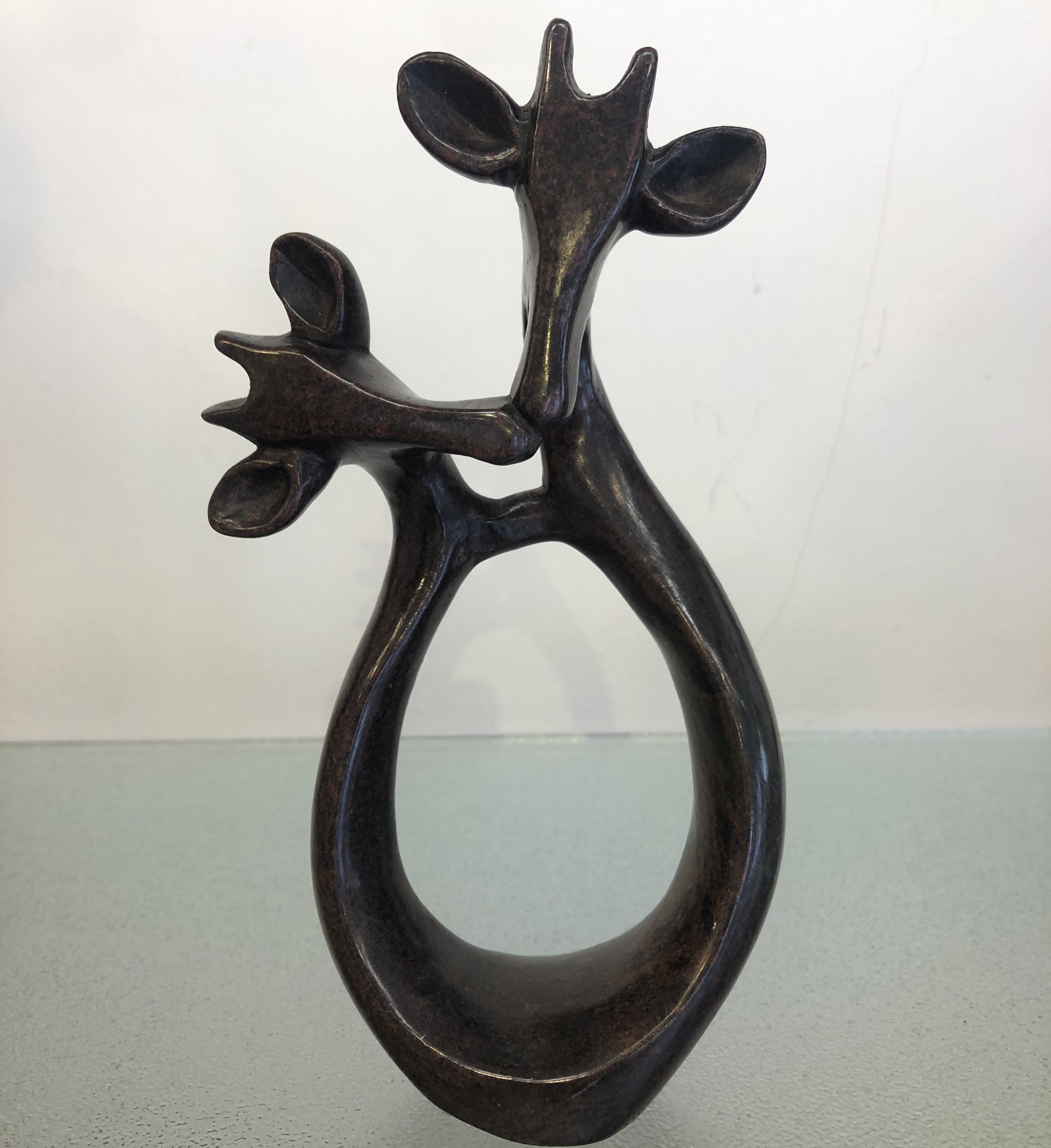 Onderstaande 2 liefkozende Giraffes zijn geweldig mooi gemaakt in Zimbabwe. Ze zijn uit één stuk steen gehouwen door een vakkundige steenhouwer.De steenhouwers laten zich inspireren door hun traditionele cultuur, door de natuur, door mensen en door dieren. Ieder stuk is uniek, vaak een abstractie van de werkelijkheid.