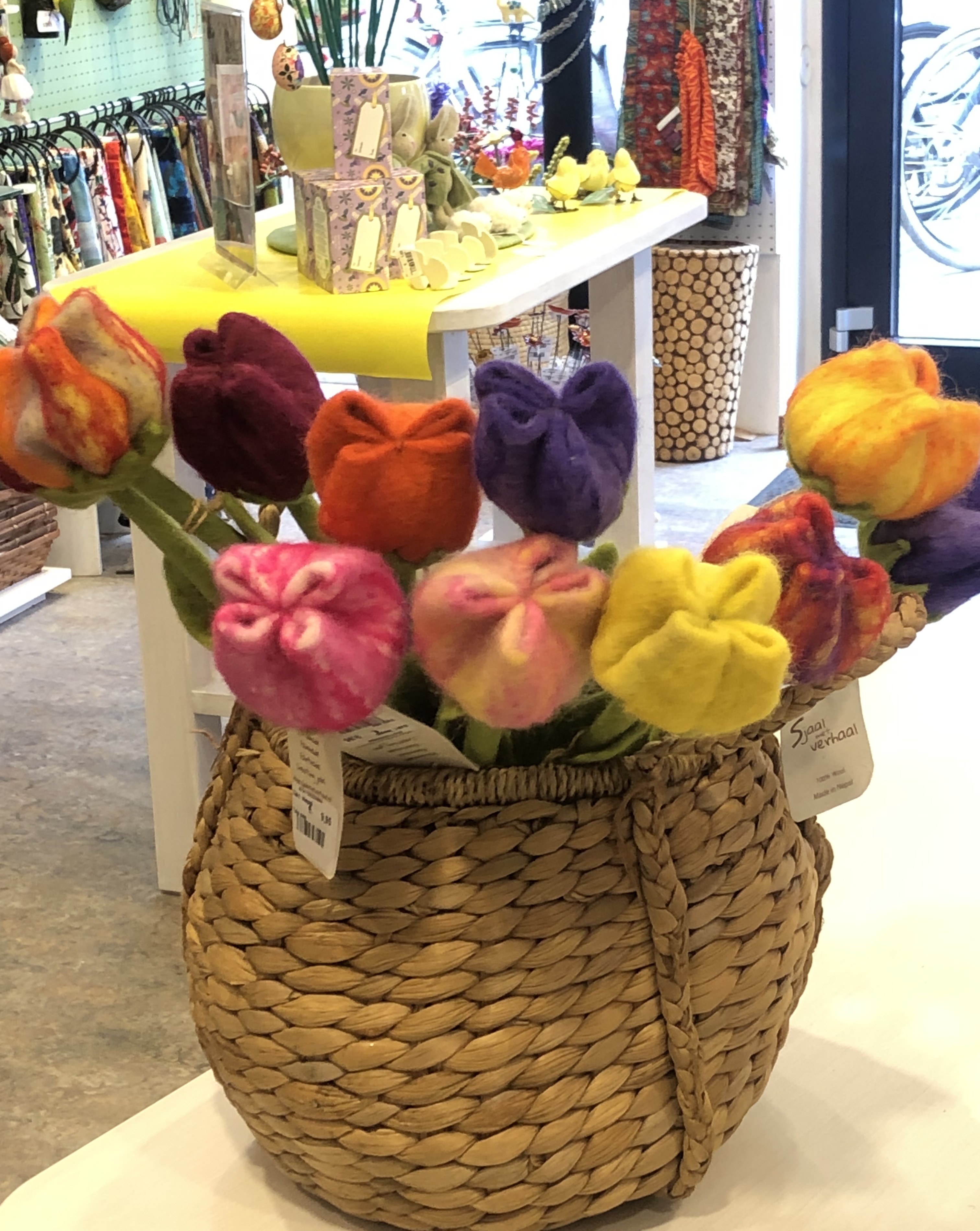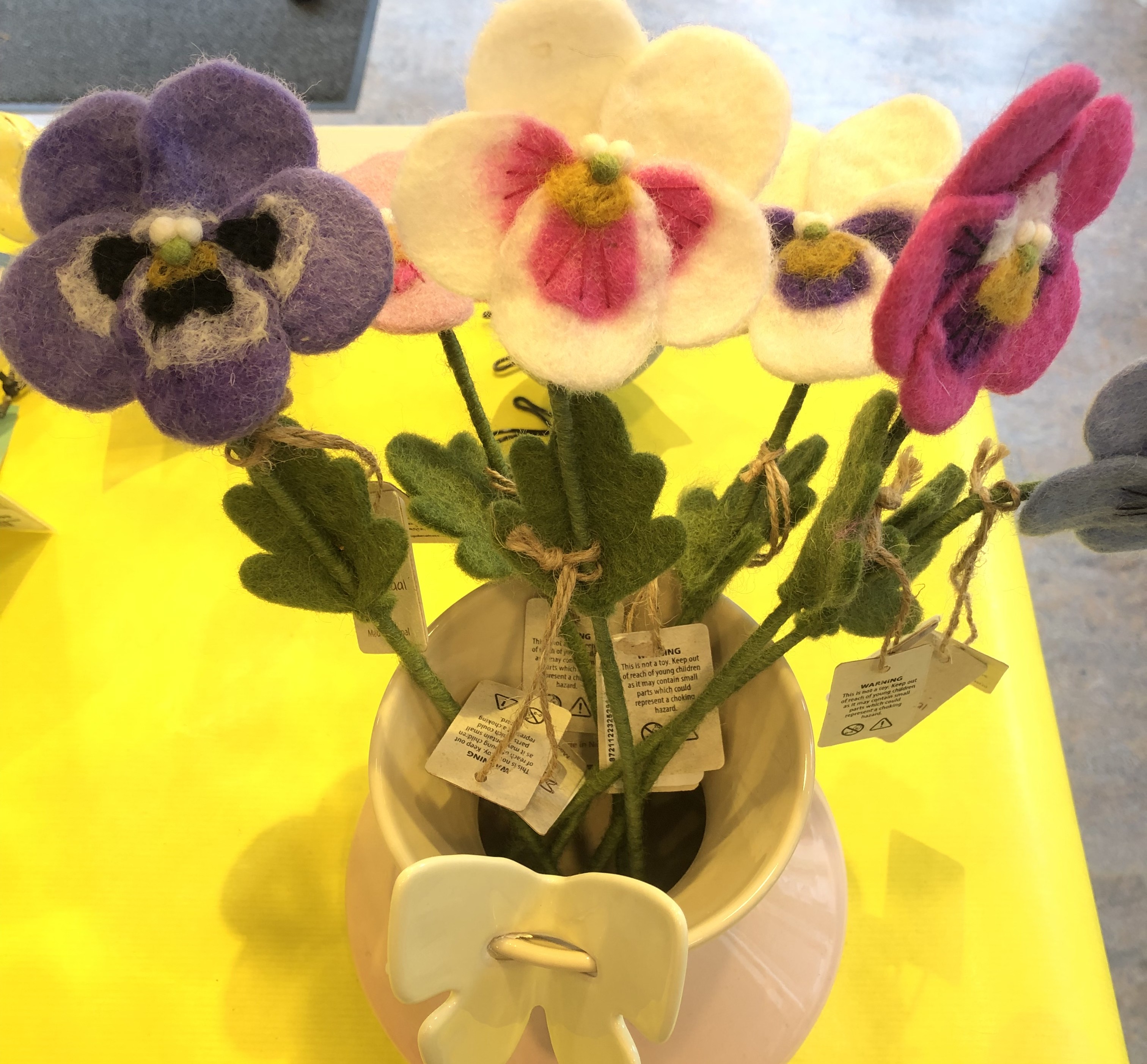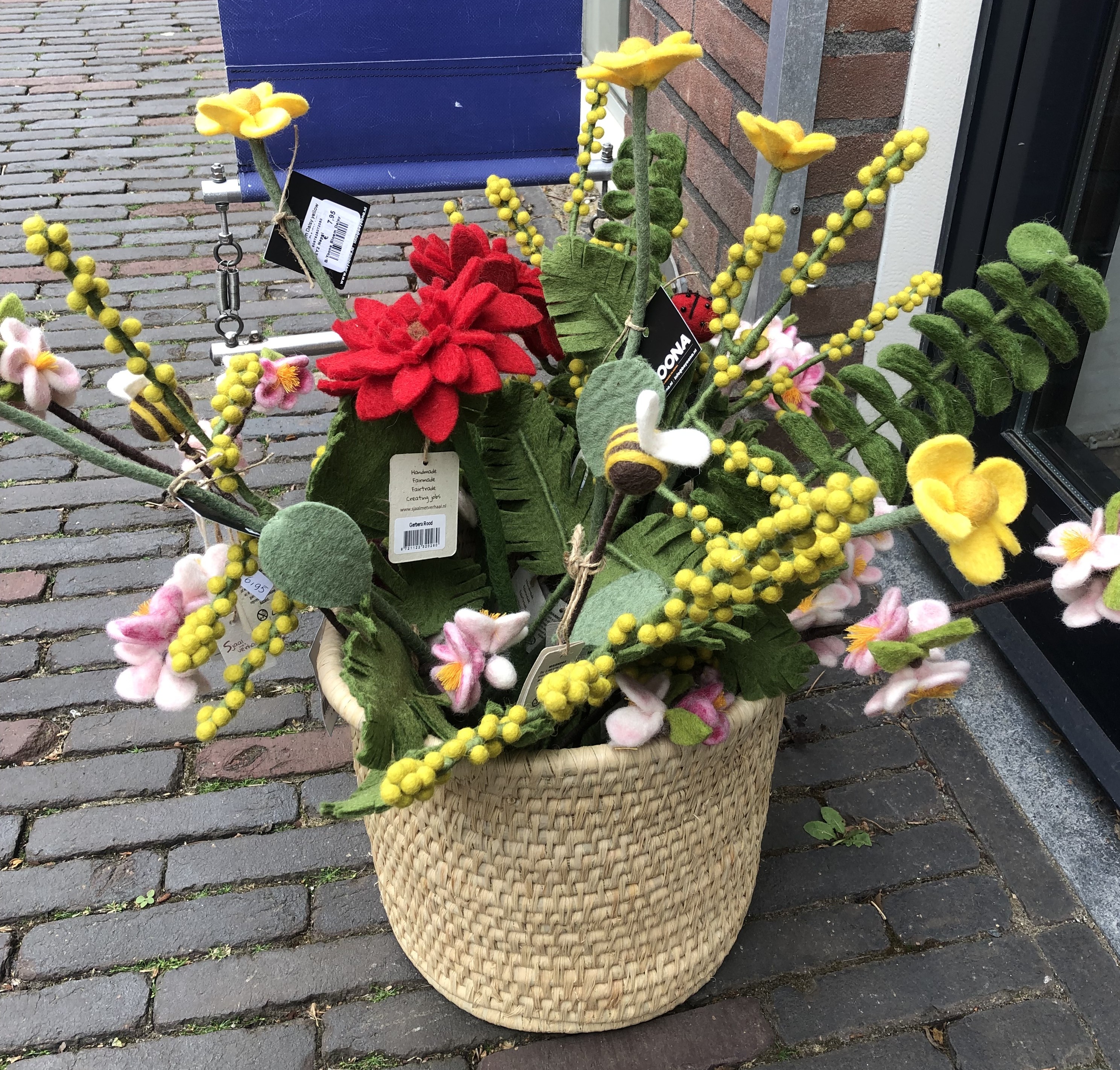 Oh wat een mooie bos, deze vilten Magnolia- bloesem, - Ridderspoor en Eucalytus takken, Lelies en Gebra's. We hebben de bloemetjes buitengezet, omdat we verlangen naar het voorjaar en de buitenlucht. Wij worden hier meteen vrolijk van. Sjaal met Verhaal bedankt voor het maken van deze prachtige bloemen. Ze worden gemaakt in ateliers in Nepal door vrouwen. Erg knap zoals ze deze kunstig in elkaar zetten.