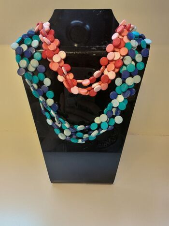 Deze halskettingen zijn gemaakt van natuurlijke materialen (kokos). Een mooie kleurschakering in blauw- of rood tinten. Lekker opvallend en kleurrijk, maar toch beschaafd. Een mooi sieraad om voor jezelf te kopen of om cadeau te geven.