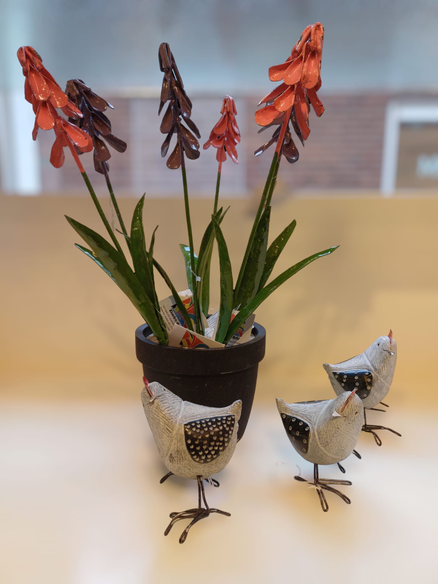 Er is ook een ruime keuze in tuinstekers, oa gemaakt van scrapmetaal. Van scrapmetal worden in Zimbabwe de meest uiteenlopende voorwerpen gemaakt. Het metaal is afval metaal dat wordt hergebruikt. Dit kan van koelkasten, auto’s en allerlei andere metalen producten komen.