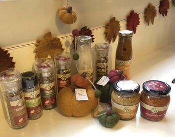 Behalve de kruiden: Karoo, Barbecue, Cape Garden, Coutry Herbs en Orangen Pfeffer verkopen wij de suazen Honey mustard en Fruity Curry en 2 soorten mosterd, nl een mosterd met Basilicum en tomaten en één met honing.Dat wordt smullen.