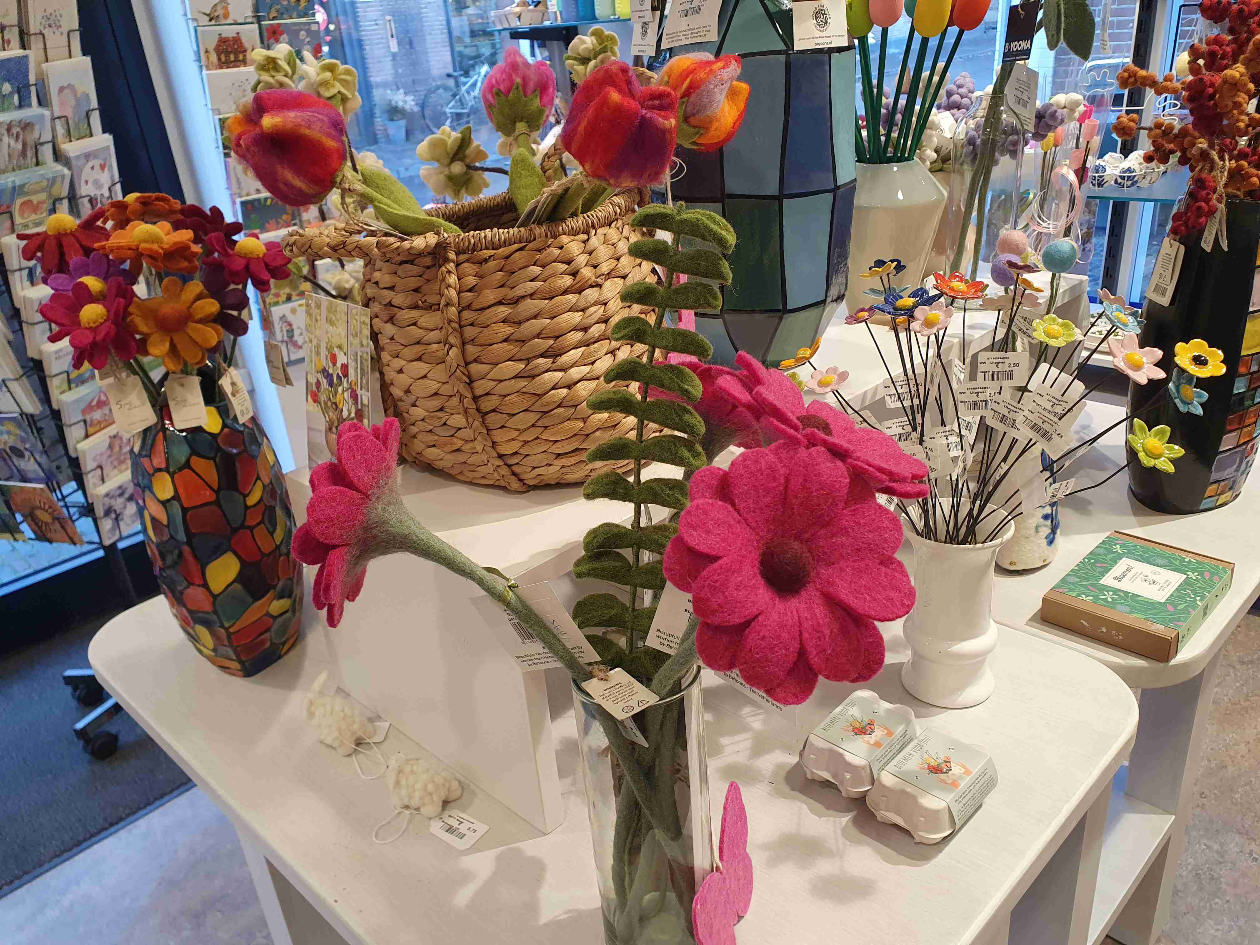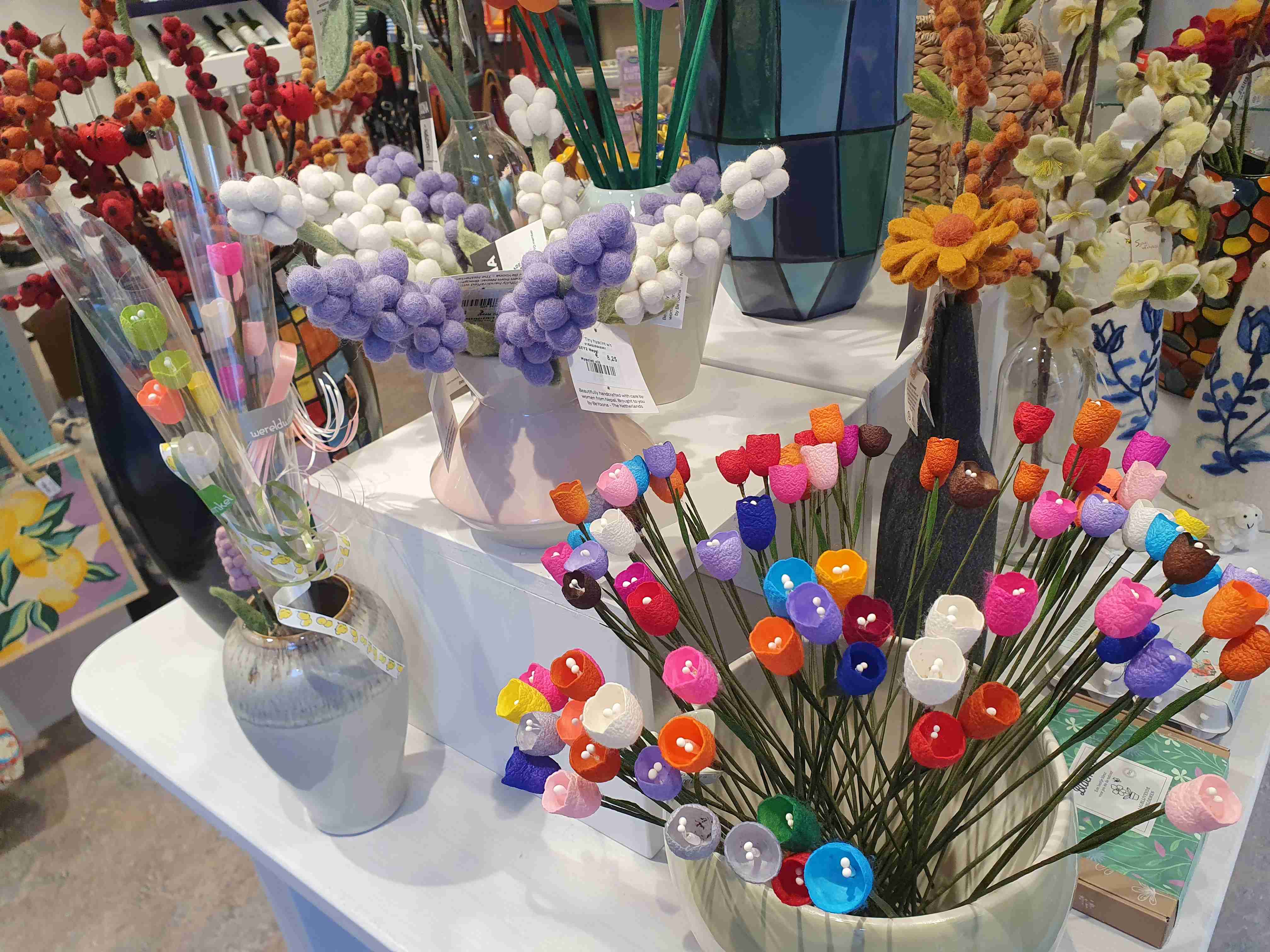 Overal bloeien volop de krokussen, narcissen en hyacinten. Ook de tulpen zijn er nu volop en in allerlei kleuren verkrijgbaar. Onze winkel staat vol met vilten exemplaren en wat het mooie hiervan is: ze zijn stuk voor stuk prachtig om te zien en verwelken niet !!